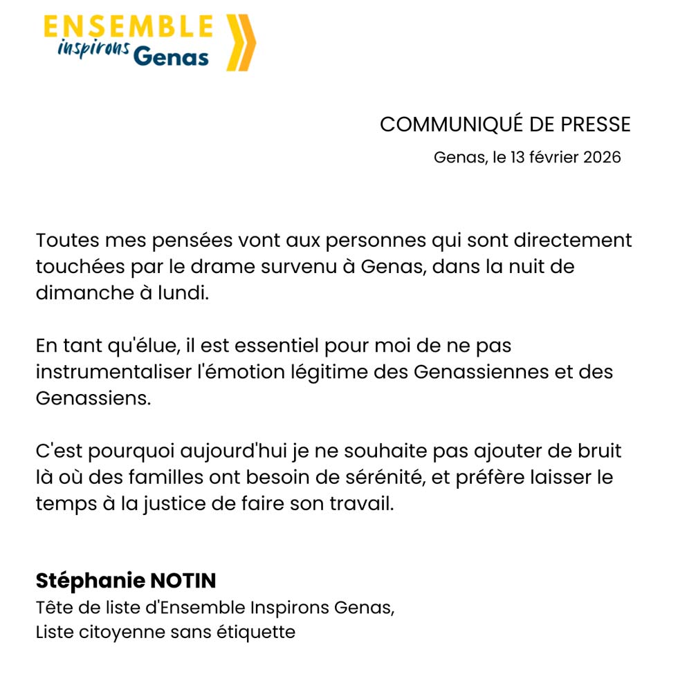 "Toutes mes pensées vont aux personnes qui sont directement touchées par le drame survenu à Genas, dans la nuit de dimanche à lundi. En tant qu'élue, il est essentiel pour moi de ne pas instrumentaliser l'émotion légitime des Genassiennes et des Genassiens. C'est...